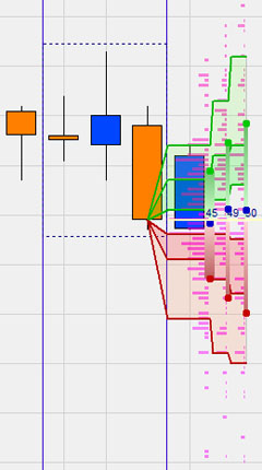 Cet exemple montre à la fois l’ordre d’achat stop et l’ordre de vente stop sur les lignes de 80% respectives. Juste au-dessus (en-dessous) de ces lignes se trouvent des niveaux de prix qui, comme indiqué par la taille des barres de l’histogramme, ont eu lieu plusieurs fois par le passé. Ce sont les limites du regroupement de prix. Un marché fort se déplacera au-delà de la limite du regroupement, à la "recherche" des prix extrêmes.