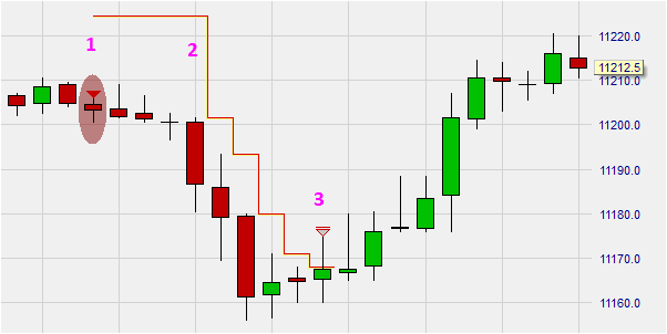 Cet exemple montre une position de vente à découvert. La position est d'abord protégée par un stop fixe. Une forte variation de prix déclenche le premier stop Profit-lock (2). Plusieurs mouvements de prix brusques supplémentaires poussent le stop à un niveau plus bas. La position est stoppée avec un bon profit (3). Notez que le marché se retourne, mais que le stop Profit-lock a déjà sauvé le profit du trader.